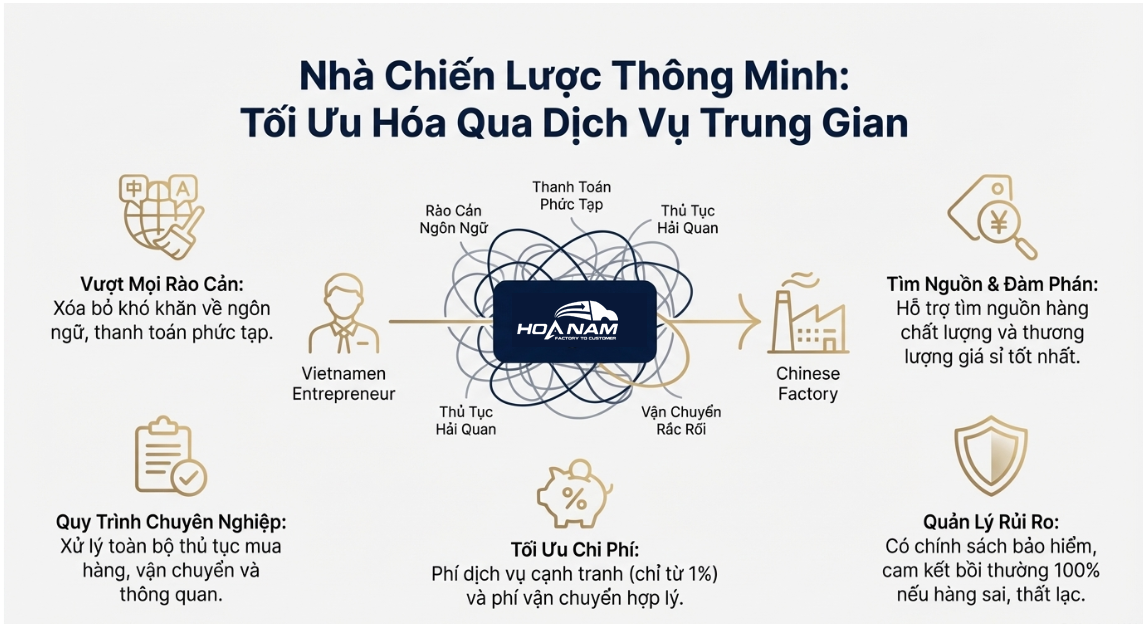 Lưu ý thực tế: Với các doanh nghiệp chưa có kinh nghiệm xuất nhập khẩu, dịch vụ ủy thác nhập khẩu hàng Trung Quốc thông qua các đơn vị logistics uy tín lâu năm như Hoa Nam Logistics thường là lựa chọn an toàn để tinh gọn quy trình từ tìm xưởng, xử lý chứng từ đến vận chuyển.
